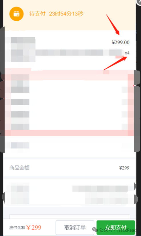 将金额不同的订单进行替换,可以支付一个金额较少的订单,然后将订单号修改为金额较大的订单,少付实际金额。
