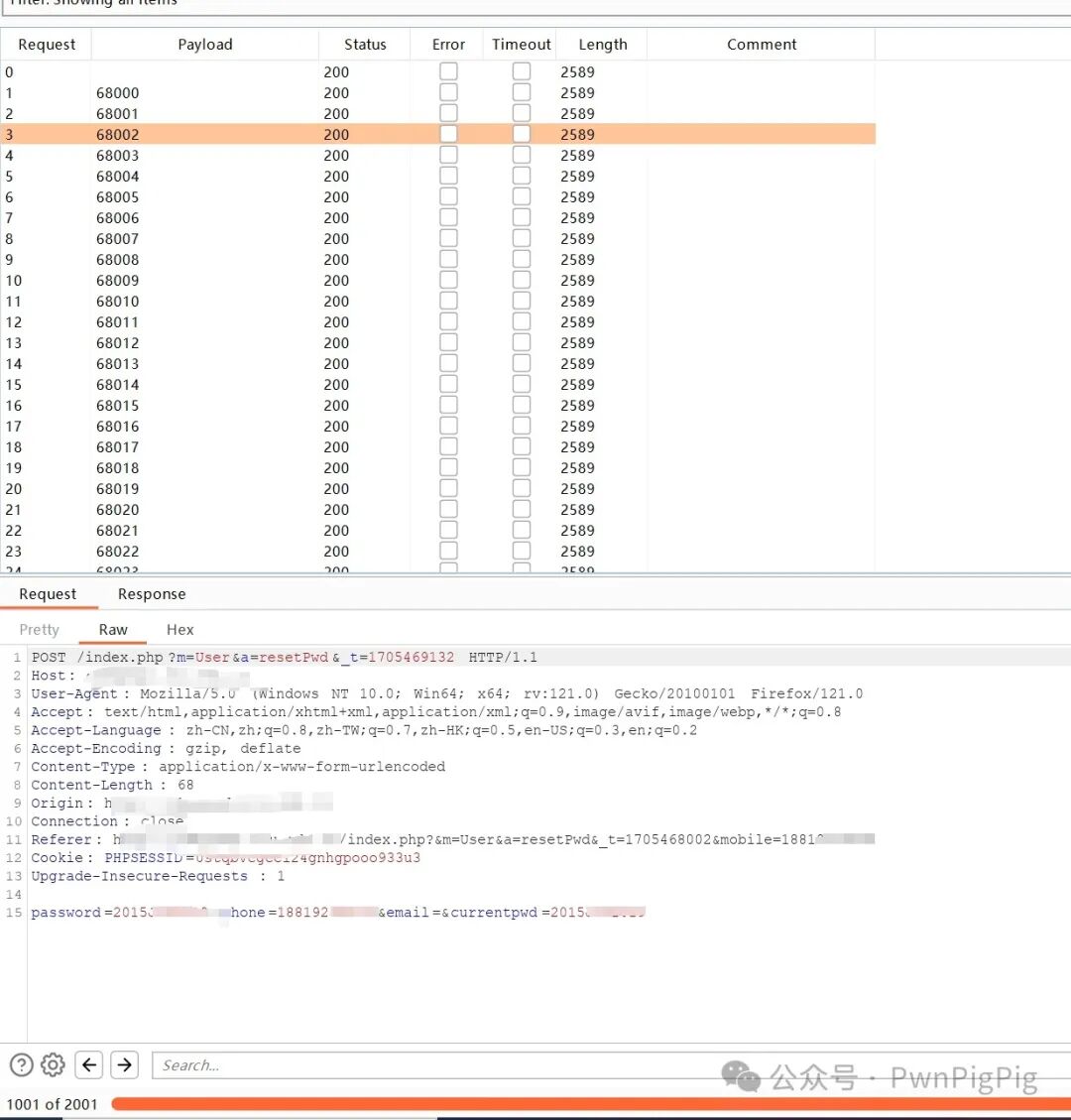 /index.php?&m=User&a=resetPwd&_t=1705471852&mobile=1881924****这里进行输入多次正确验证码后下一步抓响应包,发现_t=17054是固定不变的,只需要遍历后5位爆破,从而达到成功重置密码的效果