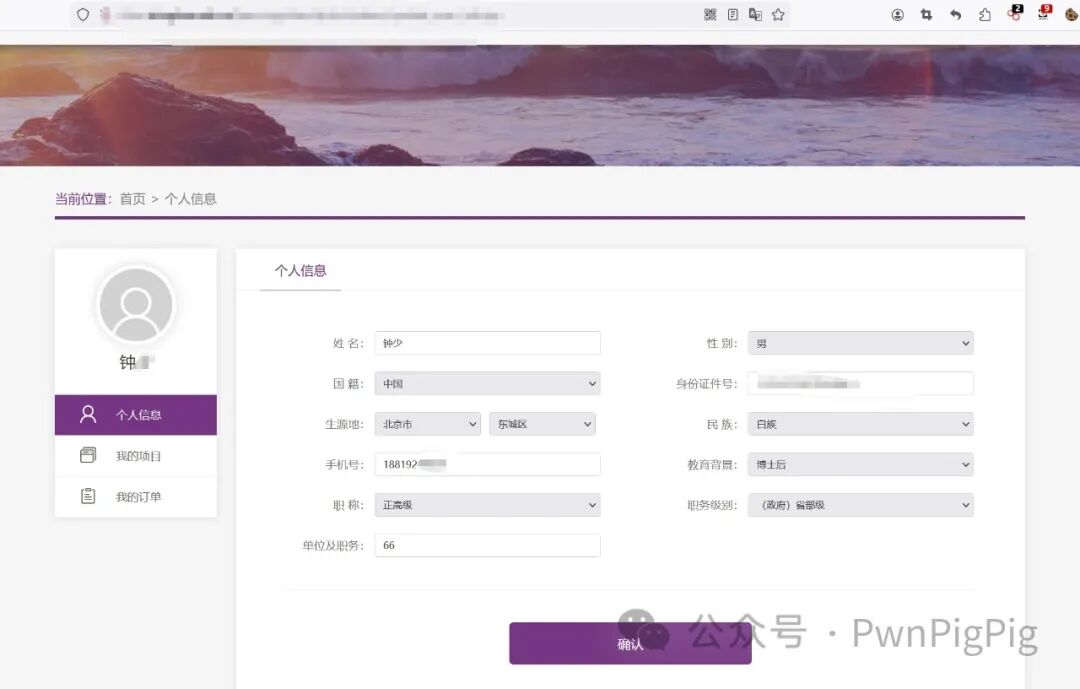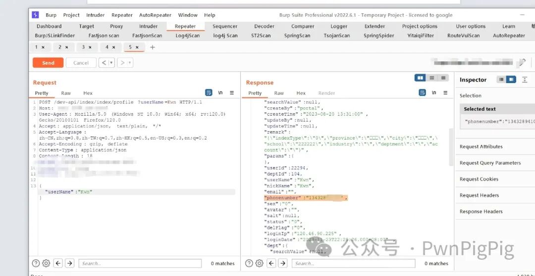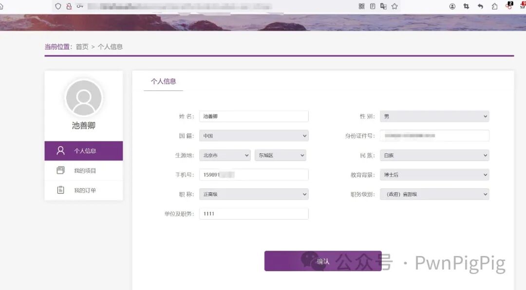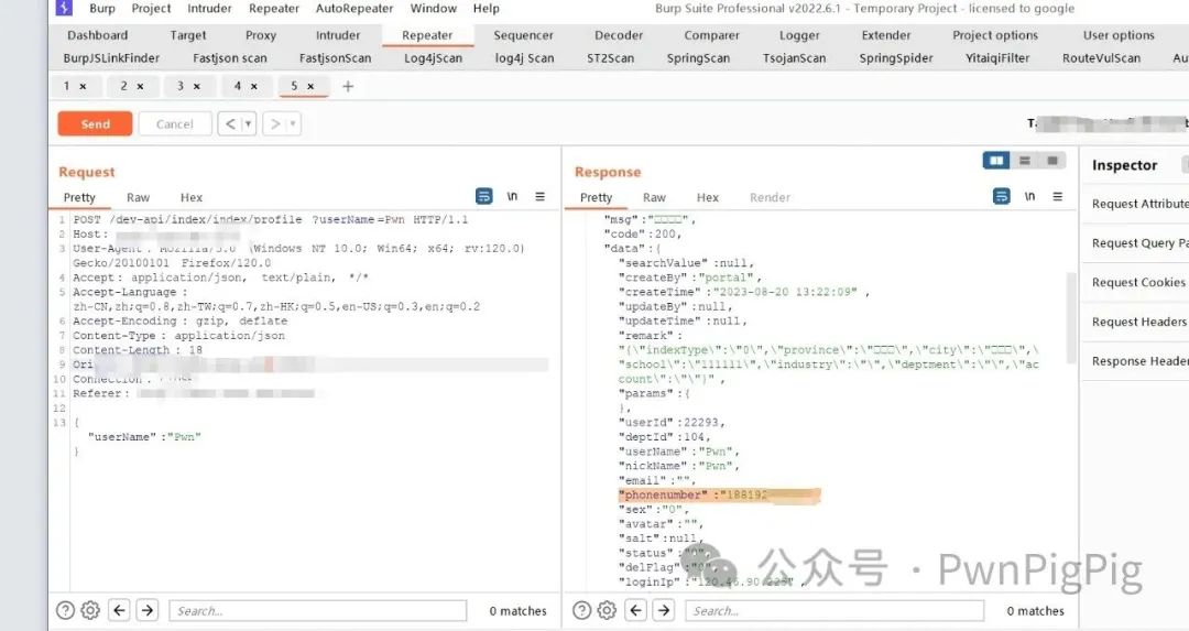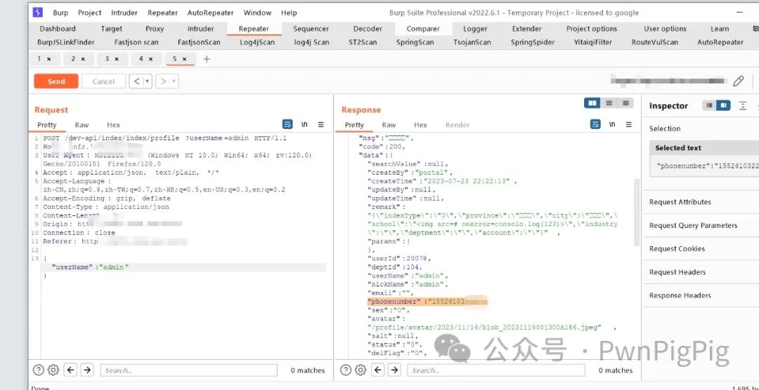 正常情况下,只能看到自己的信息,包括手机号,姓名通过在Burp的历史抓包处发现可以越权获取其他人的信息