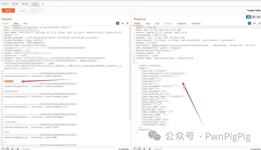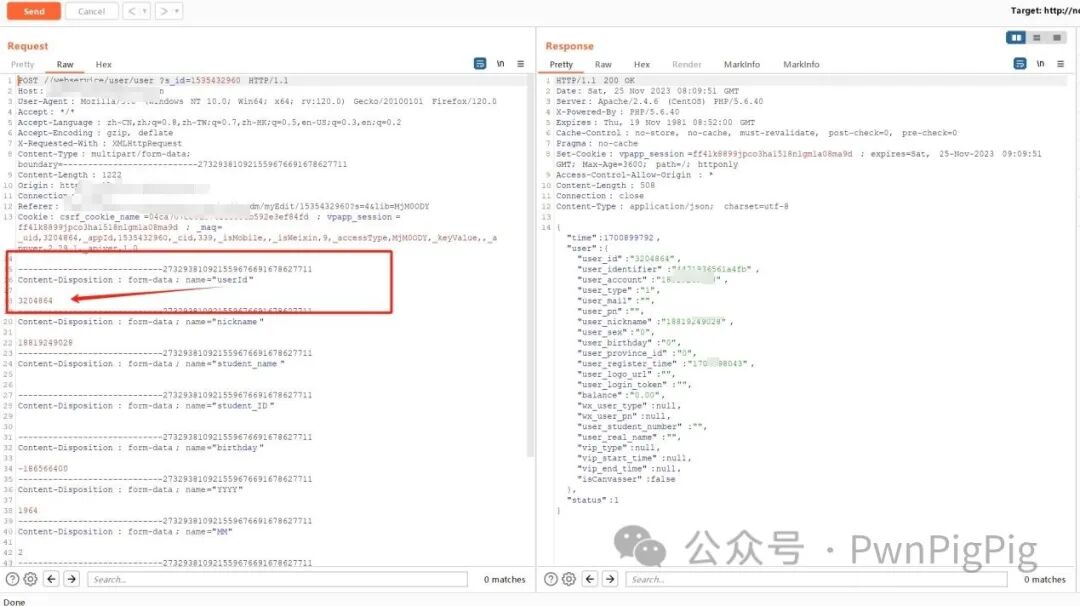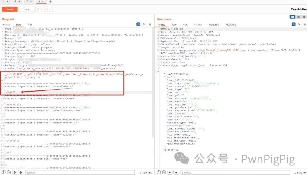 可以看到这个账号的UserID为3204865,并且响应包有我们账号2的手机号1987683****,说明我们在编辑这个账号我们改成3204864