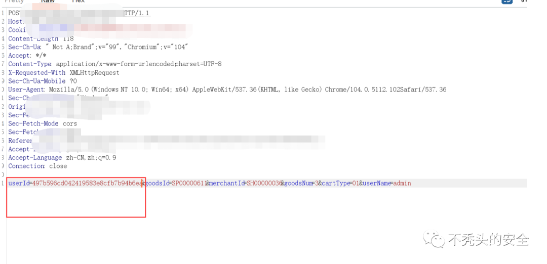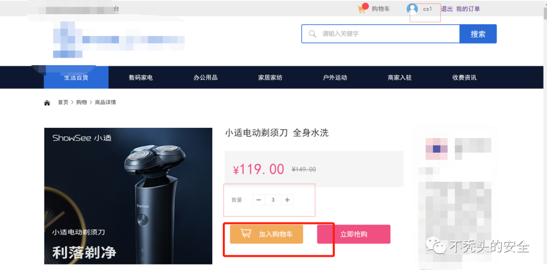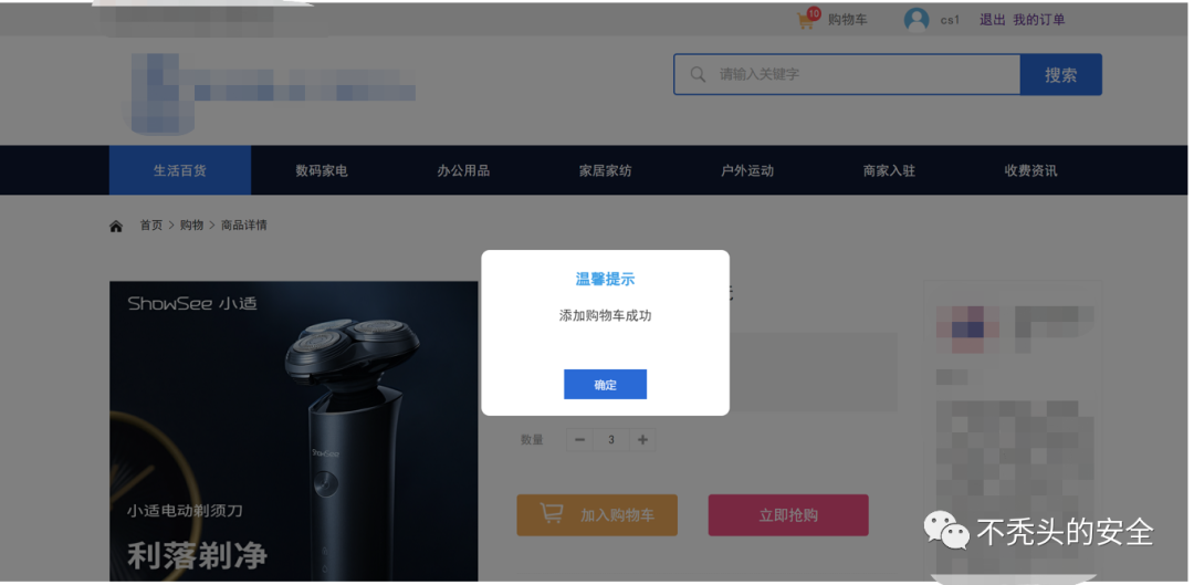 用户为cs1,添加商品数量为3,添加购物车拦包将userid值改为用户cs的userid,放包,