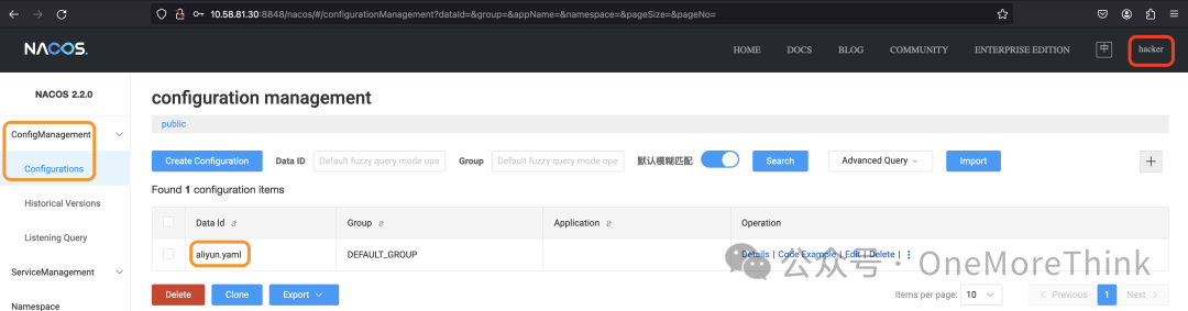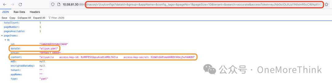 攻击者获得NACOS的访问权限后,会查看NACOS管理的所有配置文件,翻找里面的帐号密码,例如云服务的AKSK、Java程序的JDBC,从而获得对应服务的访问权限。