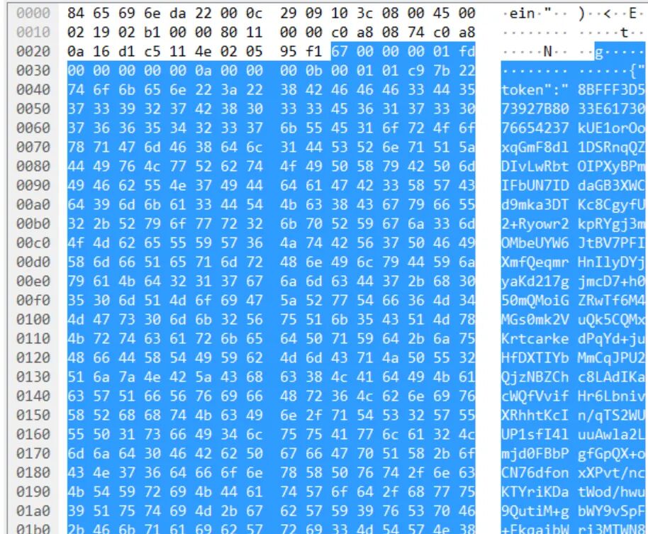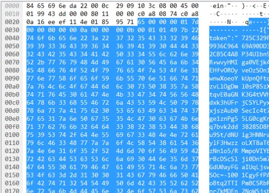 C到S传输协议UDP,并经过某种加密进行传输,过程中没有协商之类的,看一眼抓包数据: