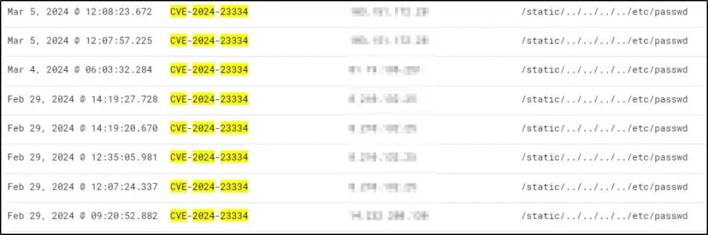 据称,从2月29日开始,针对 CVE-2024-23334 的利用尝试就被捕获,并以更高的速度持续到 3 月。