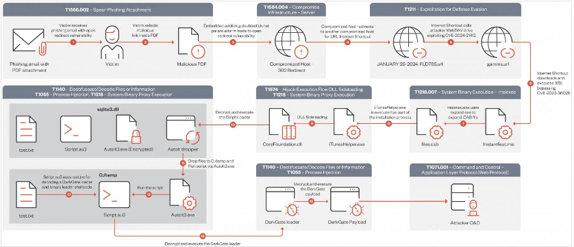 自 2024 年 1 月中旬以来,DarkGate 运营商采用的复杂且多步骤的感染链总结如下:
