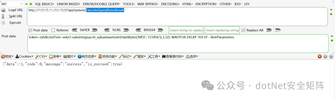 当请求为POST时触发该API运行,注入123456的MD5,再通过堆叠注入的方式实现延时注入,WAITFOR DELAY ‘0:0:10’–,如图所示。