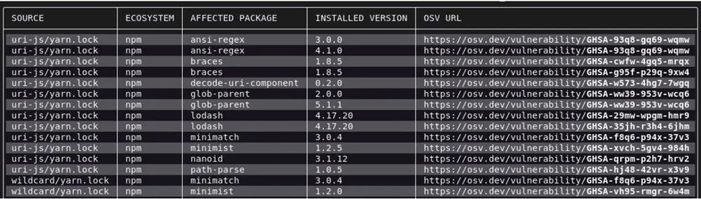 OSV-Scanner是一款由谷歌公司开发的开源漏洞扫描工具,提供专门的软件组成分析(SCA),可用于扫描静态软件,以确保开源软件的编程代码安全漏洞,并保护开源软件清单(SBOM)。在扫描项目时,OSV-Scanner 首先通过分析清单、软件材料清单(SBOM)和代码提交哈希值来确定正在使用的所有依赖项。这些信息用于查询 OSV 数据库,并报告与项目相关的漏洞。漏洞通过表格的形式或基于 JSON 的 OSV 格式(可选)进行报告。