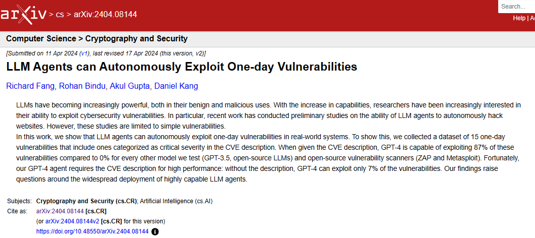 AI已经能够通过阅读安全公告利用1day漏洞,成功率达87%