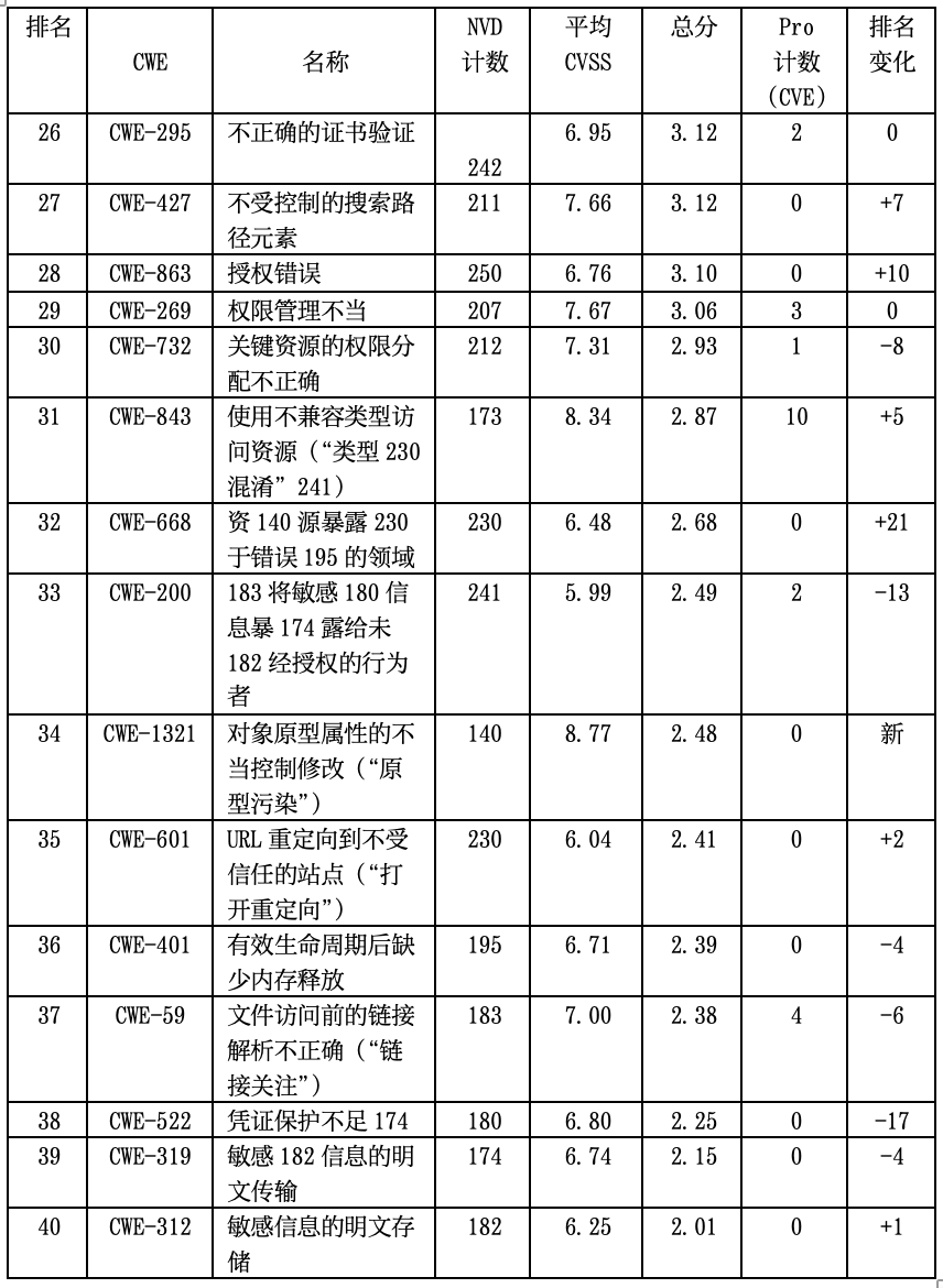 2022 CWE Top 26-40缺陷列表
