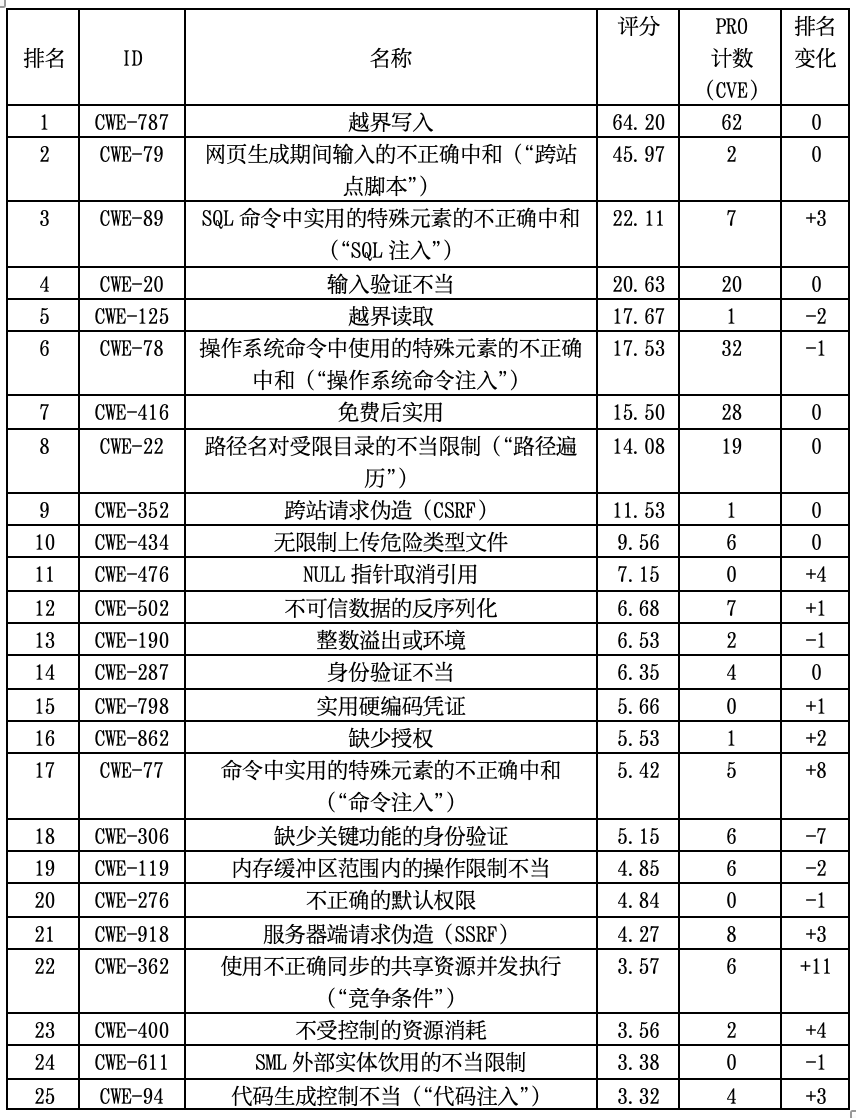 2022 CWE Top 25年度常见软件漏洞榜单