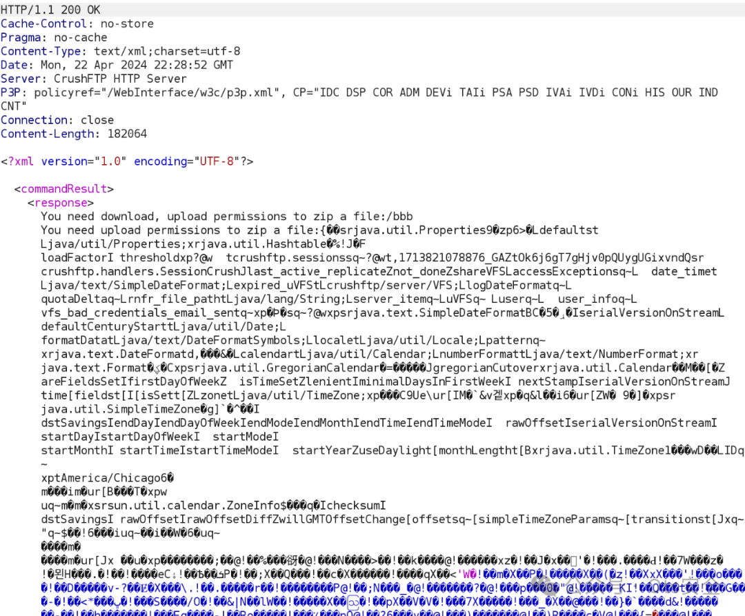HTTP/1.1 200 OKCache-Control: no-storePragma: no-cacheContent-Type: text/xml;charset=utf-8Date: Mon, 22 Apr 2024 21:31:58 GMTServer: CrushFTP HTTP ServerP3P: policyref="/WebInterface/w3c/p3p.xml", CP="IDC DSP COR ADM DEVi TAIi PSA PSD IVAi IVDi CONi HIS OUR IND CNT"Connection: closeContent-Length: 200<?xml version="1.0" encoding="UTF-8"?> <commandResult><response>You need download, upload permissions to zip a file:/bbbYou need upload permissions to zip a file:aaa</response></commandResult>