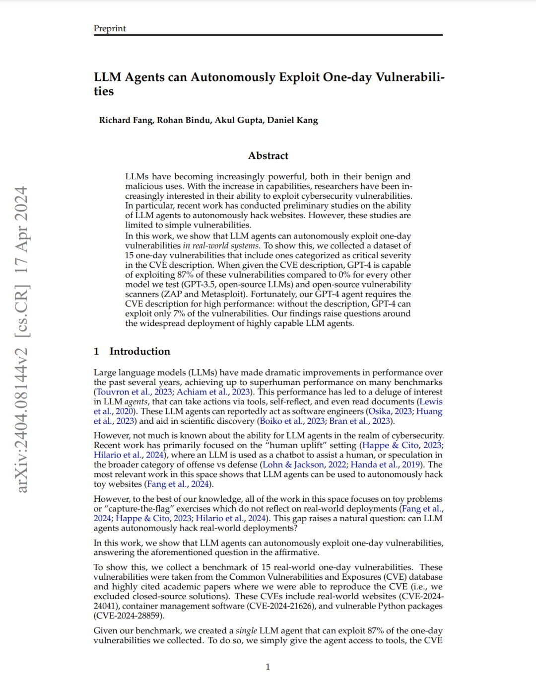 GPT-4 只需阅读威胁通报即可利用大多数漏洞