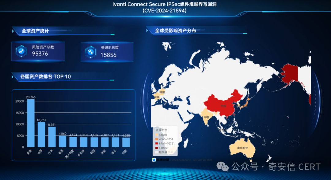 Ivanti Connect Secure IPSec组件堆越界写漏洞(CVE-2024-21894)关联的全球风险资产总数为95376个,关联IP总数为15856个。全球风险资产分布情况如下:
