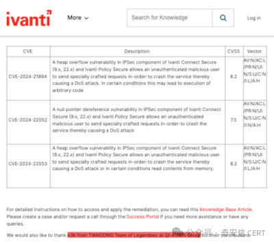 CVE-2024-21894 Ivanti Connect Secure IPSEC组件堆越界写漏洞、CVE-2024-22053 Ivanti Connect Secure IPSEC组件堆越界读漏洞、CVE-2024-22052 Ivanti Connect Secure IPSEC组件空指针漏洞由奇安信天工实验室安全研究员发现并提交。