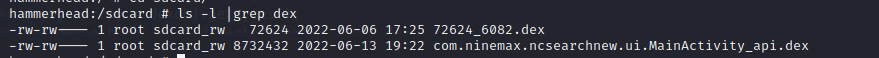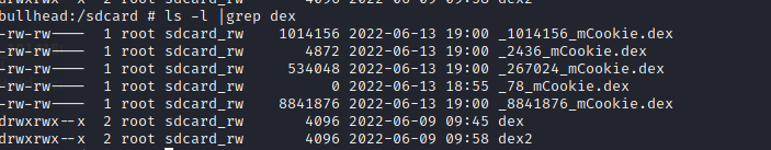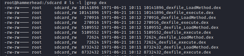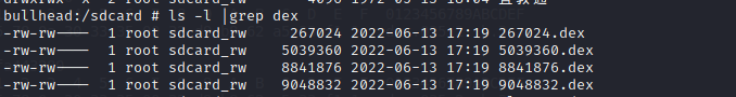 然后给程序授权sdcard权限,再次启动应用,就可以看见脱取的dex文件就保存在sdcard目录下。