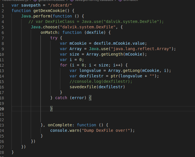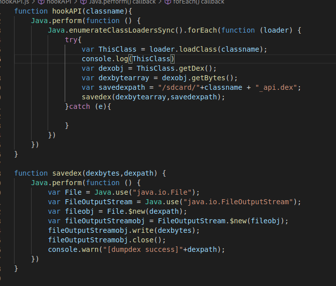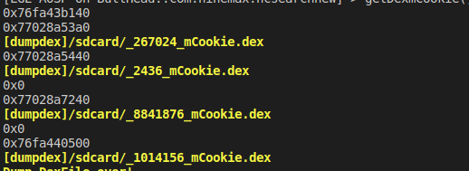 综述mCookie是在native层就是dexfile的指针,我们利用反射原理来获取mCookie,从而就可以进行脱壳了,这里我们同样使用frida演示: