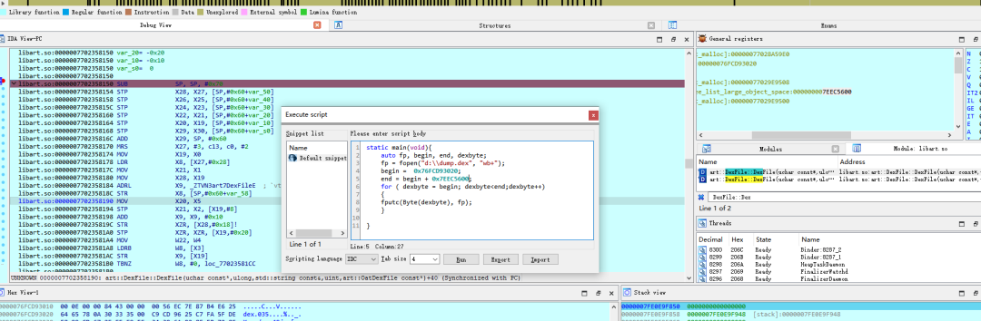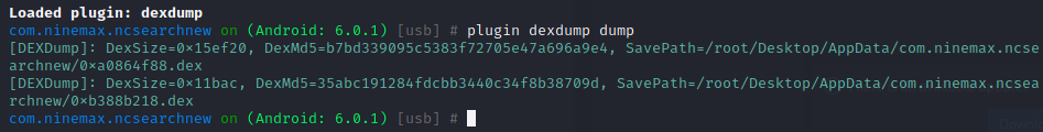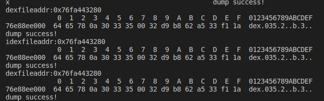 所谓动态调试法,核心原理和上面一样,就是我们在动态调试的过程中找到DexFile的起始地址和大小,然后执行脚本进行dump。