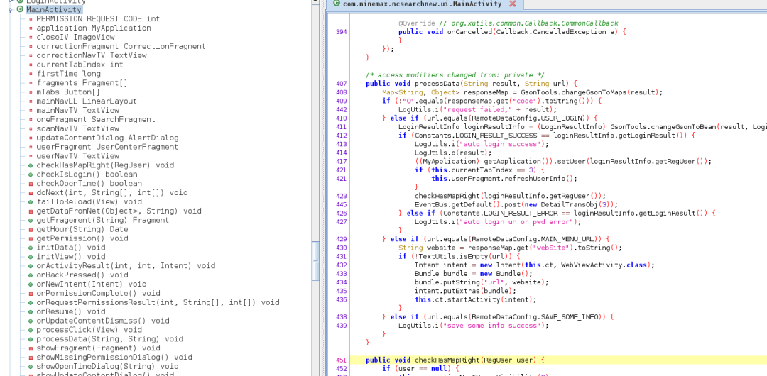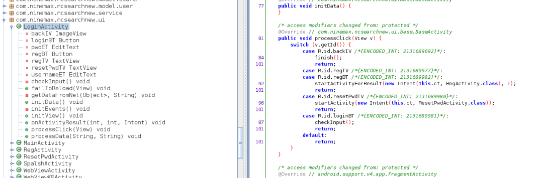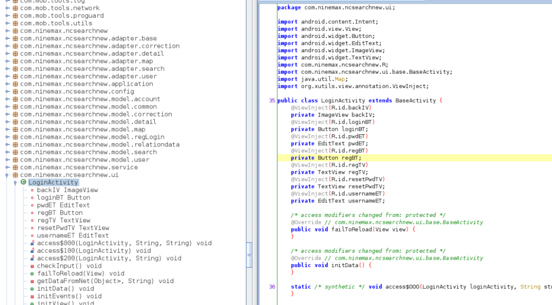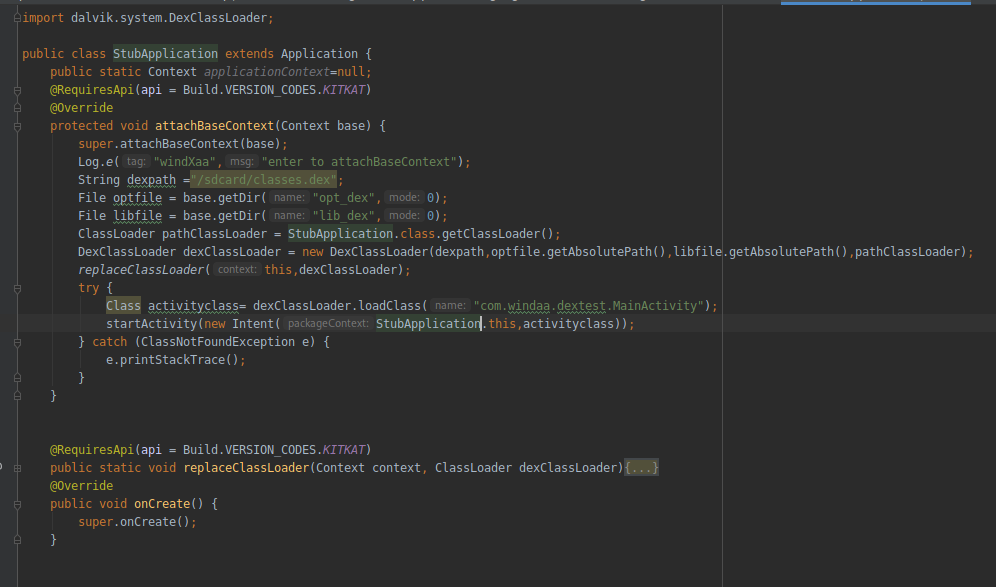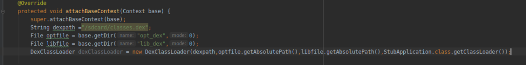 在代理类中反射调用了一些方法,很显然我们解析出的结果都无法查找,很明显就说明在Application.attchBaseContext()和Application.onCreate()中必须要完成对源加密的dex的动态加载和解密。