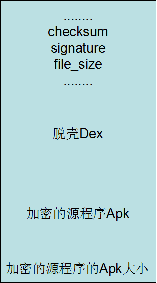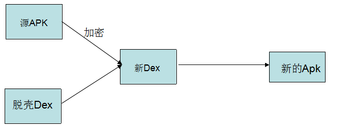 Dex整体加壳可以理解为在加密的源Apk程序外面有套上了一层外壳,简单过程为: