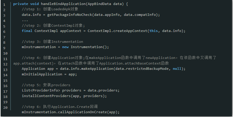 根据寒冰大佬描述,在ActivityThread完成实例化操作,调用thread.attach(false)完成一系列初始化准备工作,最后主线程进入消息循环,等待接收来自系统的消息。当收到系统发送来的bindapplication的进程间调用时,调用函数handlebindapplication来处理该请求。