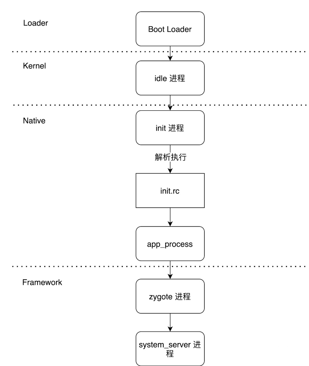加载BootLoader --> 初始化内核 --> 启动init进程 --> init进程fork出Zygote进程 --> Zygote进程fork出SystemServer进程