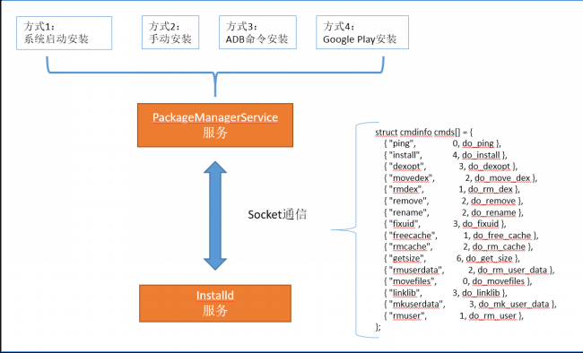 虽然安装方式不同,但是最后四种方式都是通过PackageManagerService服务来完成应用程序的安装。而PackageManagerService服务则通过与Installd服务通信,发送具体的指令来执行应用程序的安装、卸载等工作。