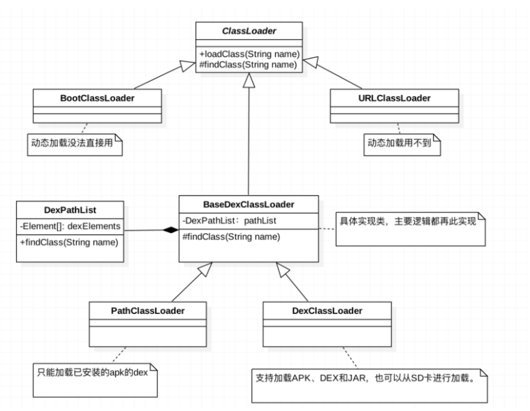 ② BaseDexClassLoader:实际应用层类文件的加载,而真正的加载委托给pathList来完成。
