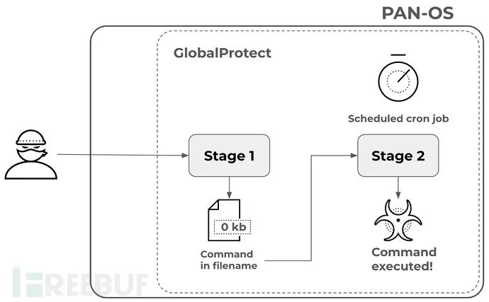 在攻击的第一阶段,攻击者向 GlobalProtect 发送精心制作的 shell 命令而非有效的会话 ID,导致在系统上创建一个空文件,文件名由攻击者命名为嵌入式命令;在第二阶段,定时运行系统作业会在命令中使用攻击者提供的文件名,进而让攻击者提供的命令能以更高的权限执行。