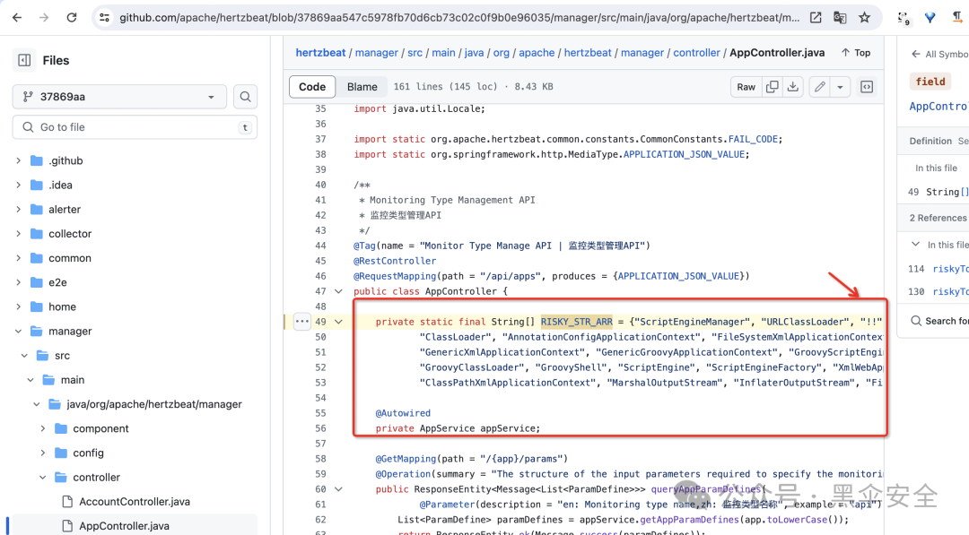 这段Java代码定义了一个名为RISKY_STR_ARR的字符串数组,其中包含了一系列的字符串元素。这些元素代表了一些可能存在安全风险的类名或者与安全相关的关键字。这个数组可能被用于安全检查或者过滤,以确保在处理输入或者执行某些操作时,不会涉及到这些可能带来安全威胁的类或关键字。