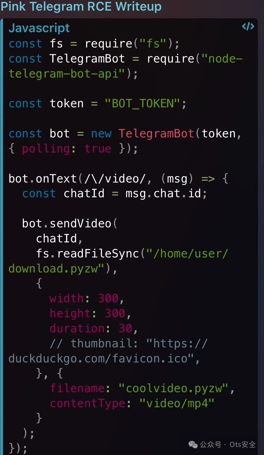 这段代码是一个Node.js脚本,用于创建一个Telegram机器人(bot),当收到指定命令”/video”时,它会向指定的聊天ID发送一个视频文件。代码中使用了node-telegram-bot-api库来操作Telegram Bot API,并且使用了fs模块来读取文件。将读取指定路径下的文件(”/home/user/download.pyzw”),并将其作为视频文件发送给指定的聊天ID,然后就是我们看到的MP4格式RCE了。
