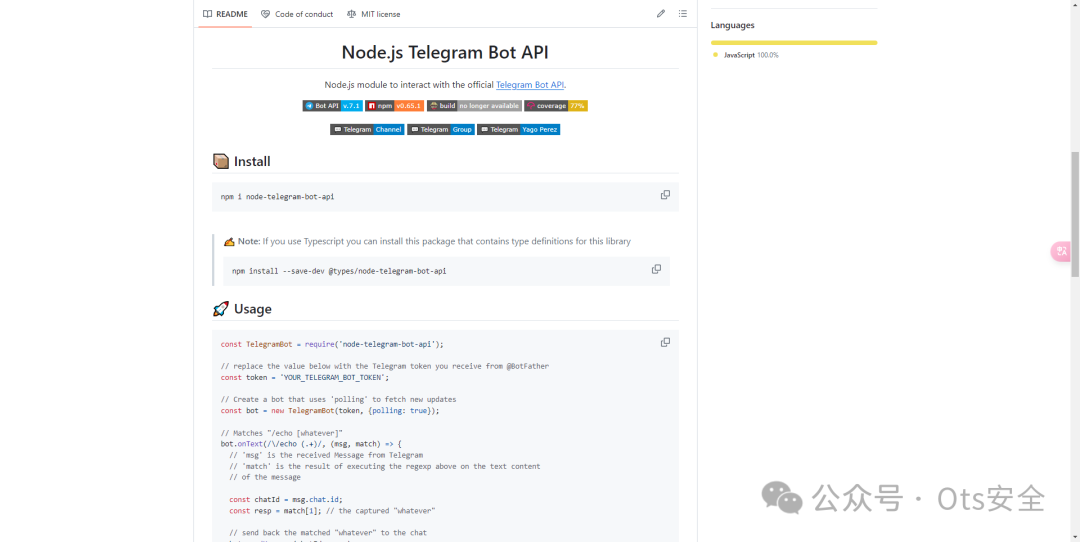 最后找到了这个项目https://github.com/yagop/node-telegram-bot-api。最后写到这里我也是看到校长的那篇文章尾部是说:做了限制,但是对于整个RCE完整复现还是得在机器人上花费时间,那么先到这里吧!