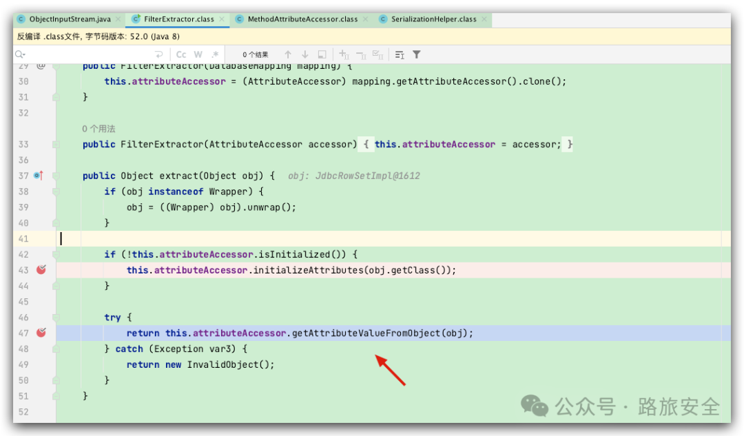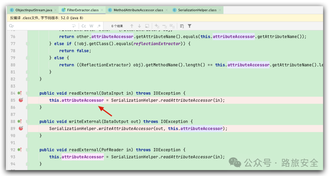 然后发现oracle.eclipselink.coherence.integrated.internal.cache.SerializationHelper#readAttributeAccessor中符合,会创建MethodAttributeAccessor对象并返回接着找利用链,oracle.eclipselink.coherence.integrated.internal.querying.FilterExtractor#extract中存在attributeAccessor.getAttributeValueFromObject调用
