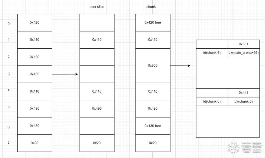 ◆free 一个chunk 让两个chunk(chunk3 与chun2)合并 这样就保留了fd(chunk 0)和bk(chunk6)在一个大的chunk中。