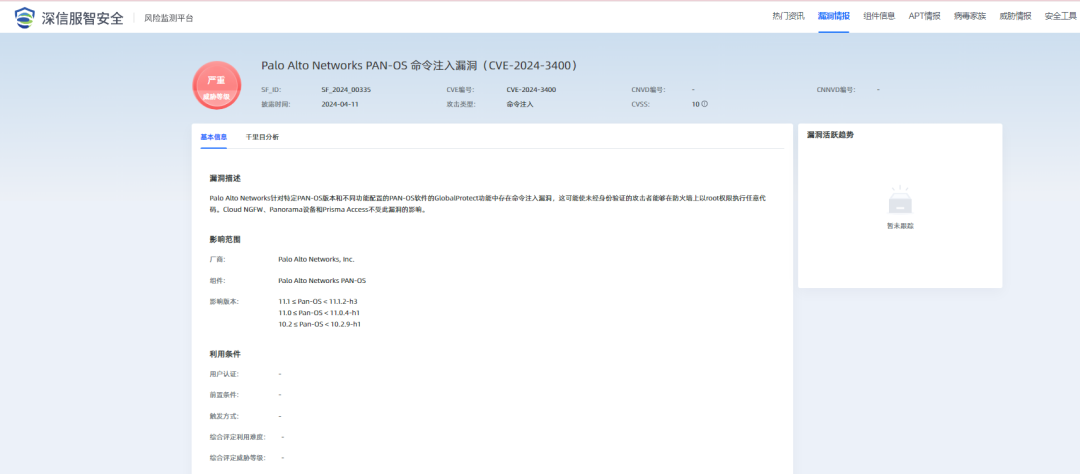 2024年4月15日,深瞳漏洞实验室监测到一则Pan-OS组件存在命令注入漏洞的信息,漏洞编号:CVE-2024-3400,漏洞威胁等级:严重。