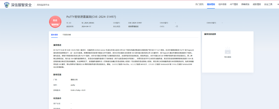 2024年4月23日,深信服深瞳漏洞实验室监测PuTTY存在密钥泄露漏洞,编号CVE-2024-31497,漏洞威胁等级:高危。