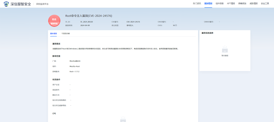 2024年4月11日,深瞳漏洞实验室监测到一则Rust组件存在命令注入漏洞的信息,漏洞编号:CVE-2024-24576,漏洞威胁等级:严重。