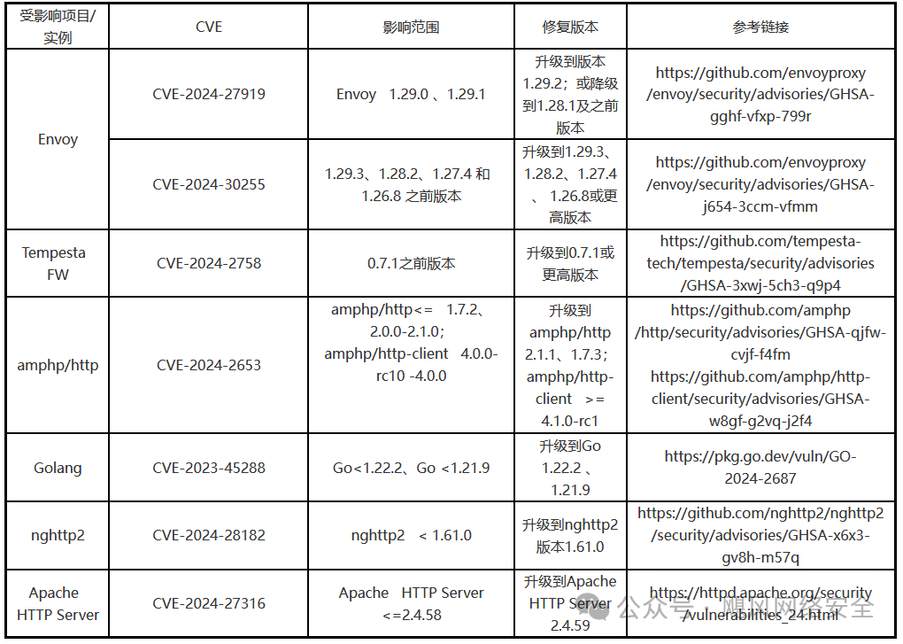 漏洞描述:HTTP/2是一种安全高效的下一代http传输协议,旨在通过引入用于高效数据传输的二进制帧、允许通过单个连接进行多个请求和响应的多路复用以及用于减少开销的标头压缩来提高Web性能,HTTP/2 CONTINUATION帧用于连续字段块片段的序列,近日监测到HTTP/2协议被披露存在拒绝服务漏洞,该漏洞被称为“HTTP/2 CONTINUATION Flood”,可导致拒绝服务(DoS)攻击,在某些实现中可通过单个TCP连接使web服务器崩溃,目前该漏洞的技术细节已公开披露,由于某些HTTP/2协议实现中没有适当限制或清理单个数据流中发送的CONTINUATION 帧的数量,攻击者可通过不设置END_HEADERS标志位,向目标服务器发送CONTINUATION帧流,从而可能导致内存不足崩溃或CPU资源耗尽而导致服务器中断,造成拒绝服务。影响范围:已知HTTP/2 CONTINUATION Flood影响多个项目,不同的HTTP/2实现可能会有特定于该实现的独特漏洞及影响,不同HTTP/2实现相对应的部分CVE ID如下:Envoy(CVE-2024-27919、CVE-2024-30255)Tempesta FW ( CVE-2024-2758 )amphp/http ( CVE-2024-2653 )Golang(CVE-2023-45288)nghttp2(CVE-2024-28182)Apache HTTP Server ( CVE-2024-27316 )Apache Traffic Server ( CVE-2024-31309 )Node.js(CVE-2024-27983)值得注意的是,在某些受影响实现中,仅通过单个TCP连接就可能导致web服务器崩溃,且恶意请求可能在HTTP访问日志中不可见,这可能使得检测和分析更加困难。