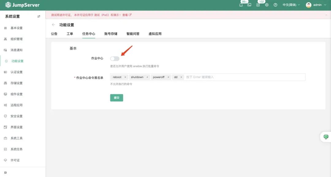 以管理员身份登录至JumpServer堡垒机。依次选择“系统设置”→“功能设置”→“任务中心”,在打开的页面中关闭作业中心功能。