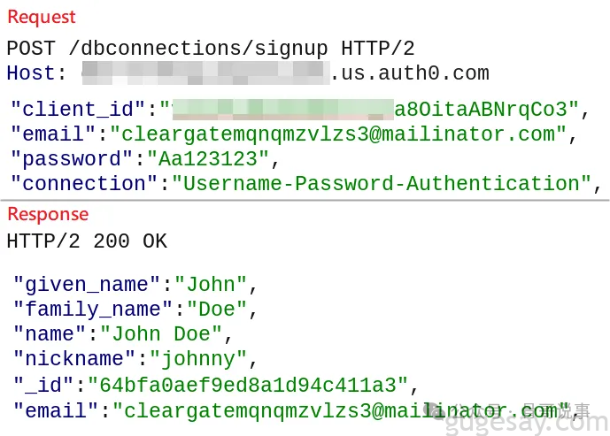 通过搜索 Auth0 身份验证的 API 文档,成功发现了一处端点,允许用户使用对 /dbconnections/signup 的 POST 请求进行用户注册。但该端点需要特定参数: