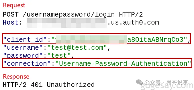 – 在 Burp Suite 中分析拦截的登录请求,提取以下参数:client_id、connection 以及其他所需的参数值