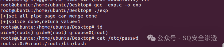 由于第一个字节为零拷贝,这样的话/etc/passwd的第一行变成了roots::…,原本第一行的内容为root:x:…,中间的x表示此用户有密码,而我们把x取消掉了,那么我们生成了一个 uid 为 0 且没有密码的用户roots,