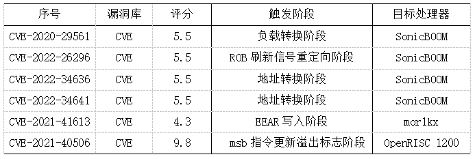 目前,国内外披露的RISC-V处理器相关漏洞比较少。CVE中与BOOM处理器相关漏洞包括CVE-2020-29561(负载转换异常),CVE-2022-26296(瞬态执行攻击),CVE-2022-34636(地址转换PMA违规的异常类型错误),CVE-2022-34641(地址转换PMP违规的异常类型错误)。此外,CVE也披露了一些其他开源处理器漏洞如OpenRISC处理器的控制器对EEAR(异常有效地址寄存器)写入逻辑错误实现、ALU单元减法指令进位标志更新漏洞等。