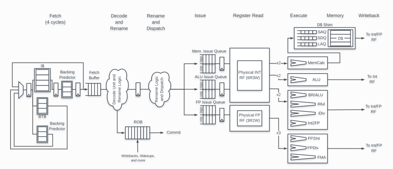 图1 SonicBOOM的处理器架构设计(见”RISC-V BOOM: Documentation and Source”, Berkeley Architecture Research Group, 2024年。)