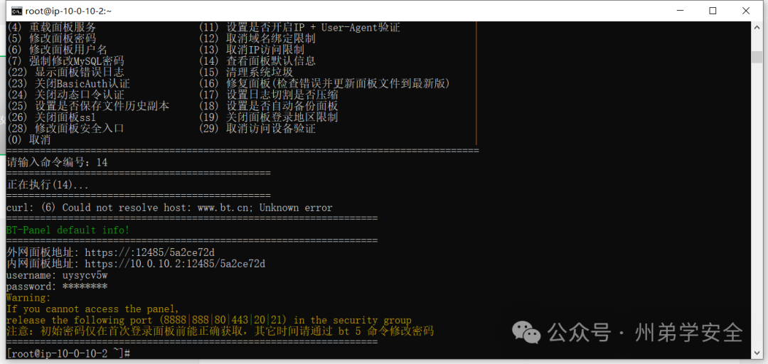 端口8821为被攻击网站端口、端口12485为宝塔端口,输入BT后修改密码然后输入14查看面板信息