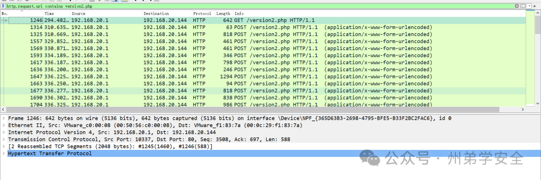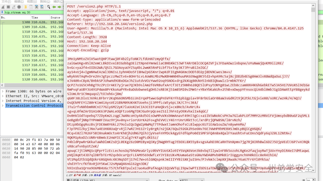 因为后台传的webshell是路由到注册页面的,所以路径register的特征是蚁剑,接着往下审计流量,看到version2.php流量,请求体内容为加密