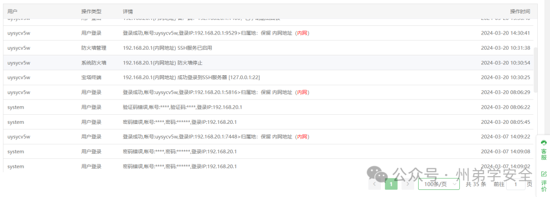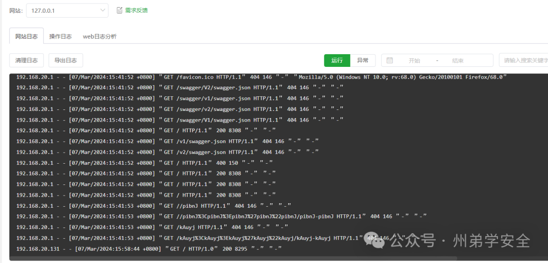 查看宝塔WEB日志、可以看到日志192.168.20.1一直在进行疑似扫描操作