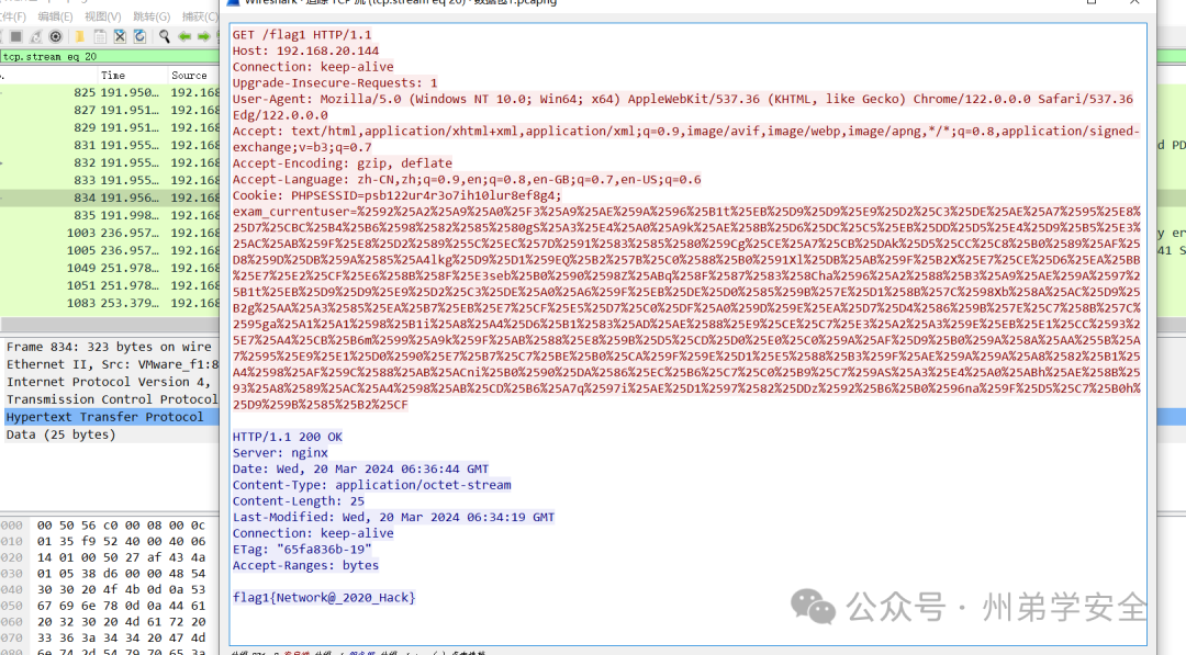 搜索流量包并过滤指定状态码 http.response.code == 200 依次遍历流量后看到flag文件
